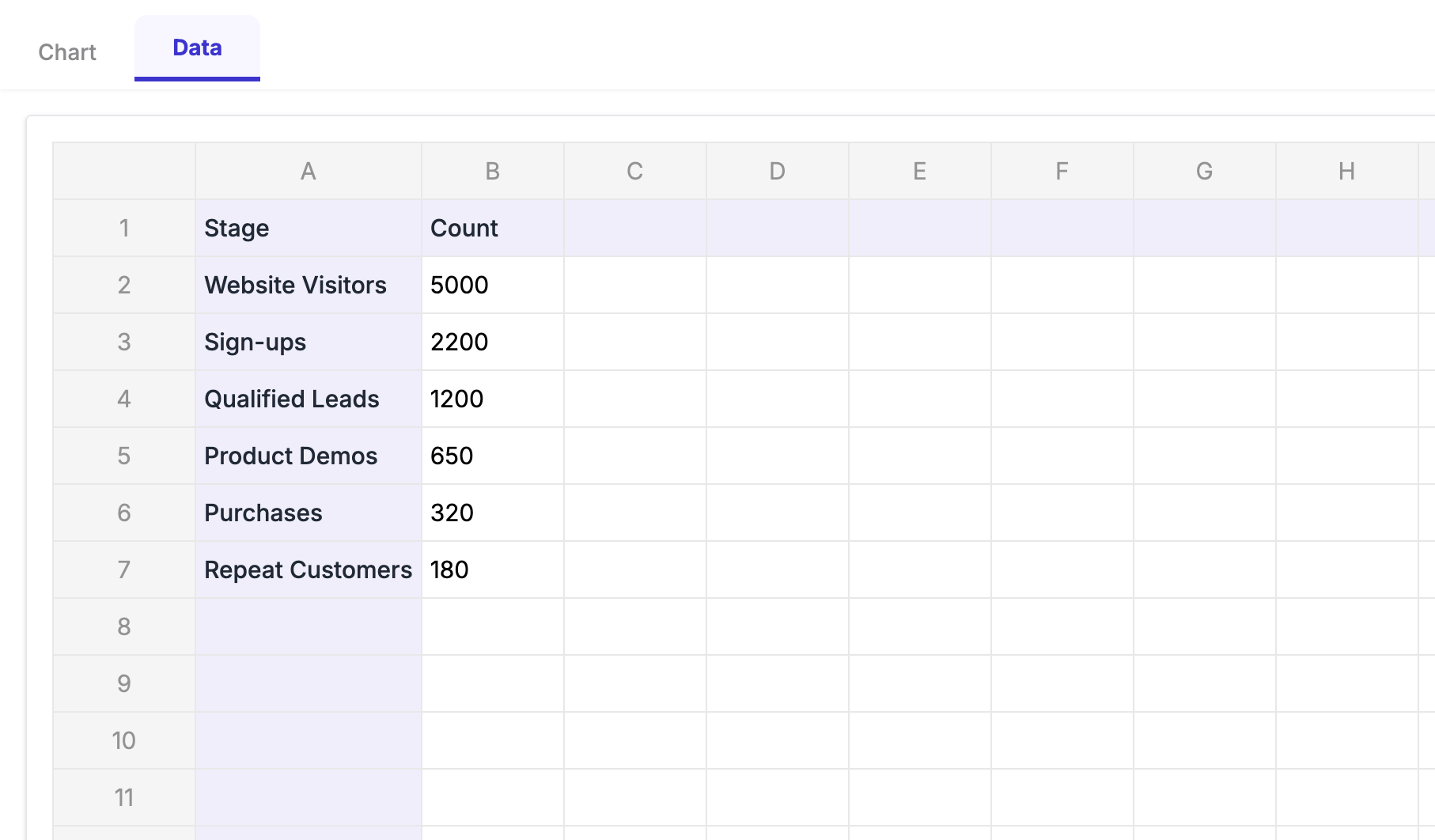 - Type in your stage names (e.g., Website Visitors,Sign-ups, Qualified Leads, Product Demos, Purchases, Repeat Customers).