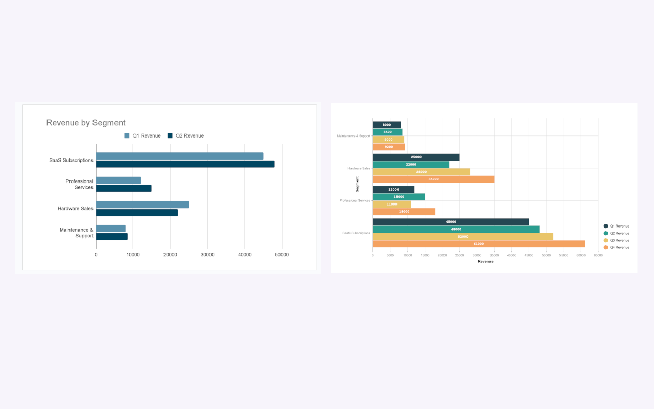 They work well for performance comparisons, trends across periods, or side-by-side evaluations.